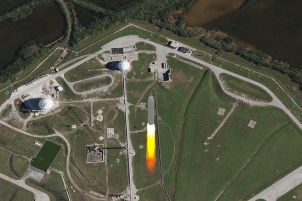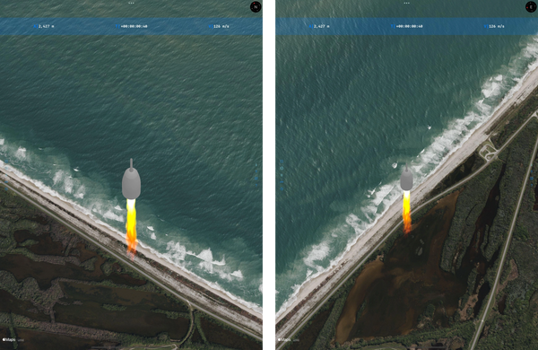 Tap the Launch button, allowing for the visual simulator to appear. The vehicle on the pad will begin countdown to its launch. On both the left and right of the screen, view two menus. The left menu controls mission playback - allowing the user to pause, reverse, fast forward, skip 15 minutes forwards or backwards, and also terminate the simulation. The menu on the right allows to control the flight information display, in-flight map, call app manual for help and also change the mode of simulator view to altitude tracker mode. If the menus are not used for some time, they will fade and collapse. To expand them again, tap on the left or right edge of the screen, respectively.