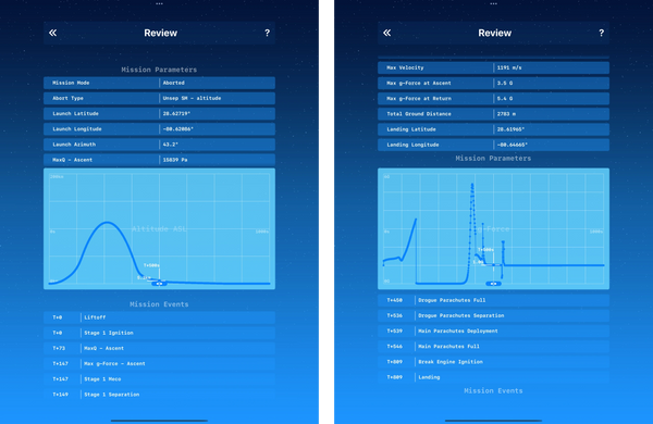 To review the main mission results, tap on the Review button in the main menu. In Review, view main mission parameters, events, as well as diagrams showing how various mission characteristics change over time. Parameters and events can be scrolled vertically, and diagrams - horizontally. Once finished with review, go back to the main menu.