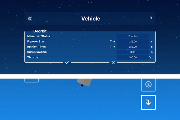 In Review, the user may notice that the mission was aborted. This happened, since the command module did not separate from the service module before reentry. To correct this aspect, go back to the Plan menu, then into Launch Vehicle view. Select the lowest flight maneuver button - Deorbit - and its description will appear in the box above. Tap this box to enter into edit mode, change its status to Enabled, and set Flipover Start time to 215 s. Since deorbit boost itself is not necessary, set Ignition Time to 215 s, and for Boost Duration enter 0 seconds. Leave Throttle with existing value.