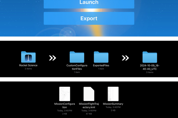 As a final step, the user may export their mission results to their device for further access outside the app. To do so, tap on the Export button in the main menu. Once complete, go to the device's Files app and find a folder named Rocket Science. Inside, open Exported Files, and there will be a directory with the latest exported mission simulation results. Inside this directory find 3 files - two of them are .csv spreadsheets containing mission configuration and summary, as well as a .kml file with vehicle flight trajectory.