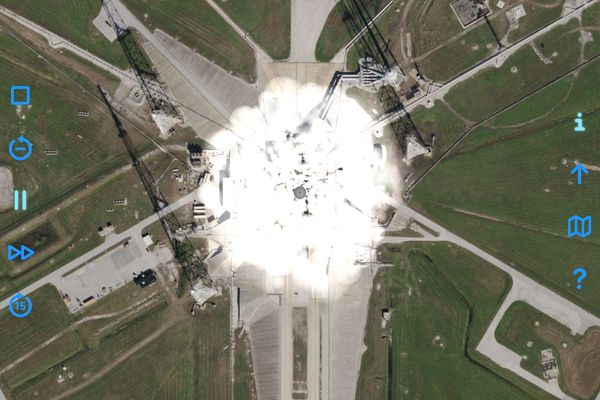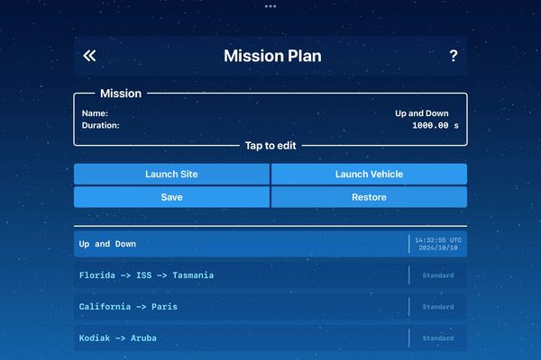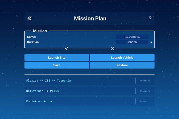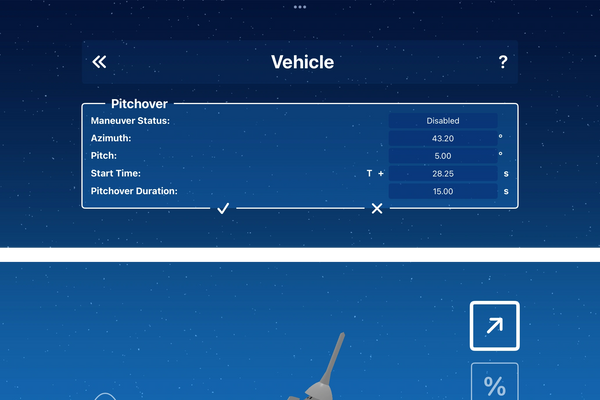While in the main simulator mode, the default view is from directly above the launch vehicle, looking straight down. To change viewpoint, use two-finger touches: pinch the screen to zoom in / out, rotate the view by moving two fingers around center of the screen, and pan the vertical viewing angle by moving two fingers up and down. To restore the viewpoint to default, double-tap with two fingers. To exit from the simulation, call the playback menu on the right and press the stop button to return to the main menu.