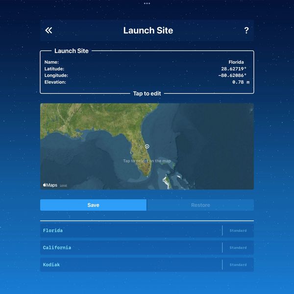 From the same mission menu, tap on the Launch Site button, and the Launch Site selection view will appear. From this menu the user can pick the location from the map, enter coordinates manually, or select it from the list. For this mission, go with one of the standard launch sites - Florida. By default, it should be set anyway, but in the case it isn't, go ahead and select it, by double-tapping its record in the list below the map. Once done, go back to the mission planning menu for the next step.