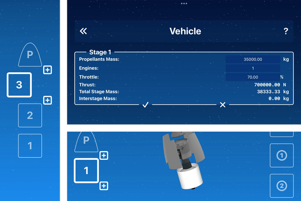 From the mission planning menu, tap on the Launch Vehicle button, allowing for the Launch Vehicle configuration screen to appear. A single-stage rocket with no maneuvers is needed. First, remove the extra stages. To do so, select each stage that is to be removed and slide it to the left - the stage will disappear. Continue until there is only one stage left. Next, configure that stage with the proper amount of propellants, number of engines, and throttle. Tap on the stage to select it. Its description will appear in the box at the top of the view. Tap anywhere in this box, to go into edit mode. Enter 35000 kg for Propellants Mass, and set the number of Engines to 1. Such a light load, does not require too much thrust, thus one engine would suffice. Furthermore, to reduce this engine's thrust, set Throttle to 70%. To complete the setup, tap on the checkmark button.